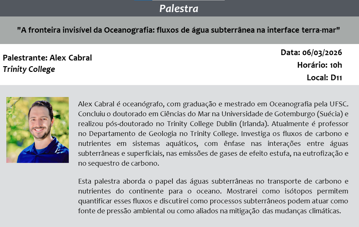 Palestra – A fronteira invisível da Oceanografia: fluxos de água subterrânea na interface terra-mar – com Alex Cabral